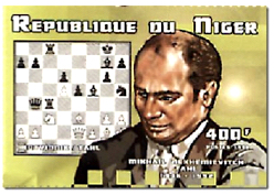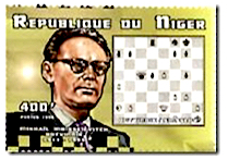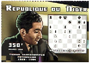Op de postzegel uit Niger zien we een stelling (na de 23e zet van zwart) uit de 12e partij om het wereldkampioenschap tussen de rivalen Botwinnik en de 10 jaar jongere Smyslov. Overigens was de stand na de afgesproken 24 partijen 12-12, en daardoor behield Botwinnik zijn titel. Opening: Slavisch.