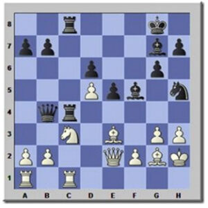 Tal: 19.Dd8 is inderdaad beter dan bijvoorbeeld 19….op e5 volgt 20.Pde2 met aanval op f7. In plaats van 20…..fxe6 zou 20….Lxe6 de voorkeur verdienen (stukruil). Nu loopt alles geforceerd af. Na 21.e5 krijgt Spassky de gelegenheid om, zijn paard van c3 als laatste druk met de aanval mee te laten doen. Het antwoord 22……h5 is de enige kans om h7 te verdedigen. Maar toch is het daarna snel gedaan. Na 24.Pg5 zou gevolgd zijn: 24. h x g 25.Dxh5+ Kg8 26.Df7+ Kh8 27.Tf3 g4 28.Txg4.