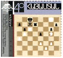 De hier afgedrukte postzegel verscheen in 1996 in zijn geboorteland Armenië: de slotstelling uit de vijfde partij. Er zijn niet zoveel postzegels aan Petrosian gewijd. Zijn portret vond ik slechts terug op een zegel uit Niger. Let daarbij niet op de schaakstand, want die is uit een partij tegen Najdorf uit 1961. Waarom die 5e partij zo leuk voor ons is om na te spelen, is het feit, dat – zie het diagram – de witte koning van Petrosian ten slotte vanaf het veld e1 op het veld g8 belandt. Daar is een hele wandeling aan voorafgegaan! Twee koningen op de 8e rij! En wel zodanig, dat wit wint! Dat is toch wel heel bijzonder! Hier de zegel uit Armenië met de slotstand van deze fraaie partij. Zie ook het diagram verderop.