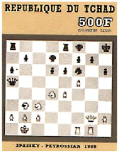 17.Tg1 Ld7 – Ik volg hier het commentaar van Tal: 17…Ld7: ‘Een betere zet heeft Zwart niet. Het is duidelijk dat Spassky meer ruimte heeft om de zwarte koning aan te vallen. Hij maakt de komende zetten de enig juiste keuze door steeds meer stukken bij de aanval te betrekken: 18. f5 Kh8 19. Tdf1 =’ Hier bereiken we de stelling op de postzegel uit Tsjaad.