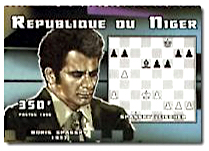 Ook nu een postzegel uit Niger. En ook nu weer valt het op dat postzegelontwerpers, ook uit onbekende schaaklanden, er in slagen een bordstand in het ontwerp op te nemen die essentieel is in de partij. Of het portret van Tal (op dat moment pas 24 jaar oud) helemaal klopt, laat ik maar in het midden.