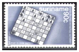 Ter gelegenheid van de Wereldtentoonstelling van Londen organiseerde in 1851 de van onze schaakstukken bekende Staunton het eerste grote internationale toernooi in de moderne schaakgeschiedenis. Winnaar was Adolf Anderssen, een wiskundeleraar aan het gymnasium van Breslau. De stelling op nevenstaande zegel uit Suriname is uit een wedstrijd die ná dat toernooi gespeeld werd tussen Anderssen en de Rus Kieseritski. Anderssen bewijst in deze partij dat hij terecht geroemd wordt als een van de sterkste combinatiespelers ooit. De stand op deze Surinaamse zegel is de positie na de 20e zet van zwart. Hierna heeft wit nog drie zetten nodig om mat te geven. Anderssen offert eerst een loper, vervolgens twee torens en ten slotte zijn dame. Ongelooflijk! Je weet niet wat je ziet. In de schaakgeschiedenis staat deze partij bekend als De onsterfelijke partij. Ik zou zeggen: speel meteen na!