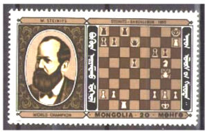 De slotstelling zien we op de 2de postzegel, eveneens uit de serie van Mongolie (zie onze 3de aflevering) waarop Steinitz afgebeeld staat.
