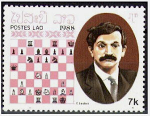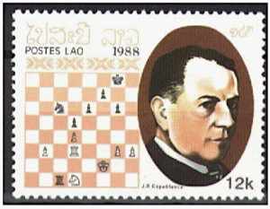 Op deze zegel van Laos uit 1988 zien we de derde Wereldkampioen, de Cubaan José Raúl Capablanca, die het in het voor de oude Lasker te warme Havana na 14 partijen voor elkaar had. Er waren 24 partijen afgesproken, maar Lasker hield het na 10 remises en 4 verloren partijen voor gezien. Op de zegel zien we de 10e partij, na de 43e zet van wit. Later heeft Lasker op diverse momenten erkend dat de speelwijze van Capablanca superieur was. Zet voor zet bouwt Capablanca hier een stevige stelling op. Maar het wordt toch even spannend. Zo zou in deze stelling na de 43e zet van wit bijvoorbeeld het zwarte antwoord 43….Pb4 een goede kans op remise hebben. [Speel vanuit de postzegelstand maar even na: 43….Pb4; 44.Td2 Tb1; 45.Pb2 Txb2; 46.Txb2 Pd3+; 47.Ke2 Pxb2; 48. Kd2 en het zwarte paard wordt gevangen!