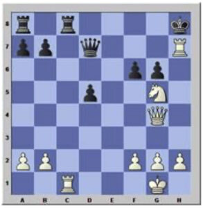 In de database van Fritz eindigt hier de partij. Ik neem aan dat de heer Von Bardeleben hier opgaf. In prisma – Schaakboek 1 van Hans Bouwmeester, 2e druk, 1961, pagina 154, analyseert Bouwmeester deze grandioze partij echter tot en met de 35e zet! Daarbij zit overigens ook een drukfout bij de 27e zet van zwart. Ik ga ervan uit, dat de zetten 25.…. t/m 35 van Bouwmeester zijn. Pak bord en stukken erbij. Speel na en begin echt op te letten vanaf de 20e zet! Zie verder die Prismapocket (nr.575) van Bouwmeester. Voor het gemak geef ik hier dus toch maar de mogelijke vervolgzetten: 25.……Kg8 26.Tg7+ Kh8 27.Dh4+ Kxh7* 28. Dh7+ Kf8 29.Dh8+ Ke7 30. Dg7+ Ke8 31.Dg8+ Ke7 32.Df7+ Kd8 33. Df8+ De8 34. Pf7+ Kd7 35. Dd6