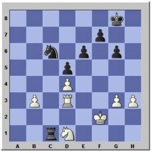 Een andere optie is: 43……Tb1; 44.Ke1 en dan kan zwart een pion winnen met 44…..Pa5!] Hoe dan ook, de makers van deze zegel hebben precies het juiste moment in deze partij uitgekozen om de stelling weer te geven!