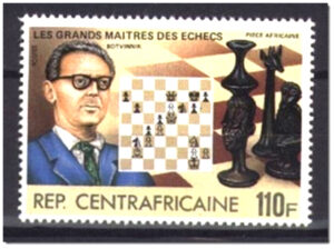 De AVRO organiseerde in 1938 een supertoernooi waaraan de allergrootsten op dat moment deelnamen, ook de 27-jarige Botwinnik en de 50-jarige (!) Capablanca. Op dit toernooi speelde Botwinnik een grandioze partij (met twee keer een stukoffer). Dit was zó’n fraaie partij, dat er zelfs twee postzegels van uitgegeven zijn, met op elke zegel een andere stand. Voor zover ik thans kan overzien is dit uniek in de postzegel-schaakstandhistorie! Daarom laat ik in deze aflevering twee verschillende zegels zien. De eerste is uit die prachtige serie van de Republiek Centraal-Afrika uit 1983. (zie ook Aflevering 7). De stand op deze zegel is die na de 29e zet van zwart. Op dat moment begint Botwinnik te offeren, zodanig dat de zwarte stelling, na een tweede stukoffer op zet 31 geheel geruïneerd wordt. De rest is afwerking met een prachtig slot.