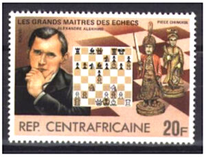 In 1983 kwam er een prachtige serie postzegels uit in de Republiek Centraal Afrika. Zegels zoals ik ze graag zie: een partijstelling, een portret van een van de spelers van die partij, en dan ook nog wat historische schaakstukken. In dit geval gaat het om het portret van de 4e Wereldkampioen: Aljechin, die in een match van 34 partijen in 1927 Capablanca de titel ontnomen had. Deze zegel laat echter een partij zien tussen Aljechin (1892-1946) en de in Polen geboren Rus Akiba Rubinstein (1882-1958). Wij kennen uit onze Nederlandse literatuur de ’tachtigers’, maar ook de schaakwereld heeft zijn ’tachtigers’. Ik doe maar een greep: Bernstein, Tartakower, Spielmann, Vidmar, Nimzowitsj, Capablanca, Réti. Allen geboren tussen1880 en 1890. Ongetwijfeld is Rubinstein van dit stel de grootste geweest. Het is echter nooit gekomen tot een WK-match ( met Lasker), omdat Rubinstein zijn hele leven een arme drommel is geweest en de heer Lasker veel te hoge financiële eisen stelde. Rubinstein won een reeks toernooien, vooral tussen 1909 en 1914. Toen het er eindelijk op leek dat in 1914 toch dé match tussen Lasker en Rubinstein kon plaatsvinden, brak de eerste wereldoorlog uit, en is het er nooit meer van gekomen. Zijn naam blijft vooral in de herinnering bestaan door een aantal zijn naam dragende varianten in diverse openingen.