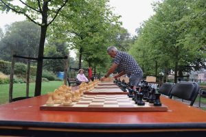 Na vier ronden waren de eerste punten binnengeharkt en was het pauze, waarin onder meer geschaakt kon worden tegen grootmeester John van der Wiel, die in een aanschuifsimultaan tegen tien spelers tegelijk speelde. Naast sponsors en andere genodigden konden ook deelnemers en bezoekers plaatsnemen aan de tafel. Van de 20 partijen won Van der Wiel er 18 en moest hij slechts twee remises afstaan, tegen Bert van der Marel (SV Philidor) en SSC’er Johan de Haas, voorwaar een knappe prestatie van beide heren. De tegenstanders van de grootmeester konden desgewenst een ‘beoordeling’ van hem krijgen over de geboden tegenstand.