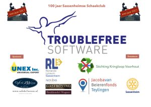 Troublefree Software, in dit geval vertegenwoordigd door Menno Hoogendoorn. De winnaar, Ywein Veldhuyzen (6 punten) van JSV De Vrijpionnen in Voorhout, mocht de titel op zijn naam schrijven en ging, behalve met een geldprijs ook met de beker naar huis. Op de tweede plaats eindigde oud SSC’er Bert de Bruin (5.5 pnt – op weerstand), 3e werd Jan Havenaar (5.5 pnt). In de B-groep werden de prijzen uitgereikt door Stichting Kringloop Voorhout, door Sanne Wijntjes, die echter op het laatste moment verhinderd was en de honneurs liet waarnemen door eveneens Menno Hoogendoorn. De B-groep werd gewonnen door Johan de Haas (6 pnt), die vast en zeker door zijn partij tegen GM van der Wiel voldoende inspiratie had gevonden om de zege naar zich toe te trekken. Tweede werd Klaas Been (4.5 ptn) en derde Fred Thijssen (4 ptn). De prijzen voor de jeugdgroep werden uitgereikt door de Rotary Sassenheim, in de persoon van Ronald van der Graaf. De jeugdgroep werd gewonnen door Milan de Winter (6.5 punten), eveneens van JSV de Vrijpionnen. Tweede in deze groep werd Pepijn Zohlandt (5.5 ptn) en derde Job Reitsema (5 ptn). Bij de D-groep ten slotte ging de overwinning afgetekend naar Fabian Meijer (6.5 punt), 2e werd Pieter de Koning (5 ptn) en 3e Daniel Marjenburg (4.5 pnt). Hier werden de prijzen uitgereikt door Frans Heemskerk, namens het Jacoba van Beierenfonds.