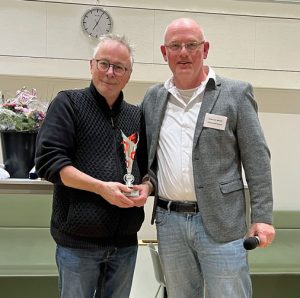 Het was lang wachten dit seizoen, maar ik had eindelijk weer genoeg concentratie om een vierkamp te gaan spelen en ook nog te kunnen winnen in het 85ste Noteboom weekendtoernooi. Afgelopen weekend, van 20-22 februari 2026, werd deze editie door maar liefst 525 schakers bezocht. Met een aangepast speelschema lijkt dit een voltreffer. Ook het meetellen van de partijen voor de FIDE-rating kan een goede zet zijn geweest. Een absoluut record qua deelname. Sinds de start in 1936 waren er nog nooit zoveel deelnemers. Het was voor mij een beetje moeilijk om dit keer te gaan deelnemen, omdat ik op de slotdag jarig was. Nu kan je thuis ook je verjaardag vieren met een gastengroepje, maar ik heb een weerzin tegen onder meer commerciële feestdagen als bijv. Moederdag, Vaderdag, Valentijnsdag en de dag van wie of wat dan ook of zelfs een verjaardag. Na het toernooi boek ik een tafel en ga met m’n beste vrienden een hapje eten om het te ‘vieren’. Let op dat er ook in het woord vierkamp – dus met z’n vieren – het woord vieren zit! Foto rechts van Maaijveld: een beker voor mij uitgereikt door toernooidirecteur Rudy van Wessel, die na dertien jaar gaat stoppen als TD.