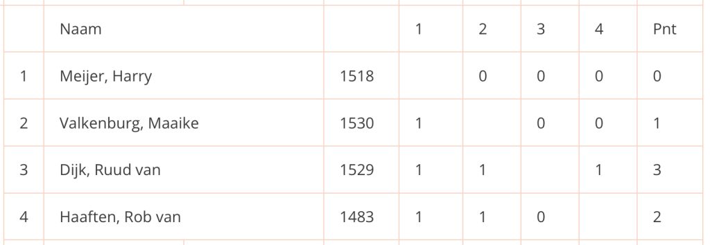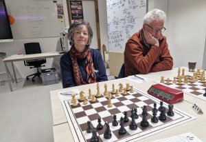 Ondanks het gigantische aantal deelnemers was de deelname vanuit SSC minimaal. Naast Jan en Maaike B. deed alleen Marcel mee. Bijzonder is nog te vermelden dat in het klaslokaal waar ik speelde twee vrouwen aanwezig waren, die beiden naar de naam Maaike luisteren (die ene luistert niet altijd, overigens). Ik zag op de eindstand dat ook zij 1 uit 3 had gescoord. Wat een eensgezindheid! Hieronder nog wat foto’s van de hand van toernooifotograaf Paul Koks. Marcel heb ik op het foto-overzicht op de Noteboom-website niet achter het bord weten te spotten, maar misschien heeft hij zich wel bewust schuil gehouden; dit was niet zijn toernooi dit jaar. Wel staat hij op de overzichtsfoto, maar dat is wel wat je noemt een zoekplaatje. Succes met zoeken, dus!