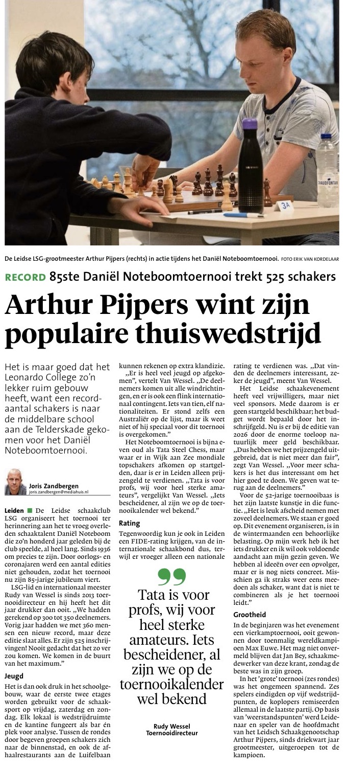 We hielpen mijn collega bij het Leidsch Dagblad, Joris Zandbergen, aan wat informatie over Noteboom (naast een interview met TD Rudy van Wessel) en dat resulteerde weer in een paginagroot artikel in het LD. Onderaan kunnen jullie dit artikel lezen. De mannen van de LD-sportredactie hebben zich waarschijnlijk een deuk gelachen om mij nog even te noemen in het artikel. Waarvoor mijnerzijds grote dank uiteraard, mede omdat ze mij noemen onder het tussenkopje: Grootheid. Enfin, weer enige ratingpunten winst en een leuke dag gehad. Ik ben het meeste trots op de winstpartij op mijn verjaardag tegen koploper Joost Beltman, want die had 2 uit 2 en ik had 1½ uit 2, dus ik moest winnen en dat lukte me.