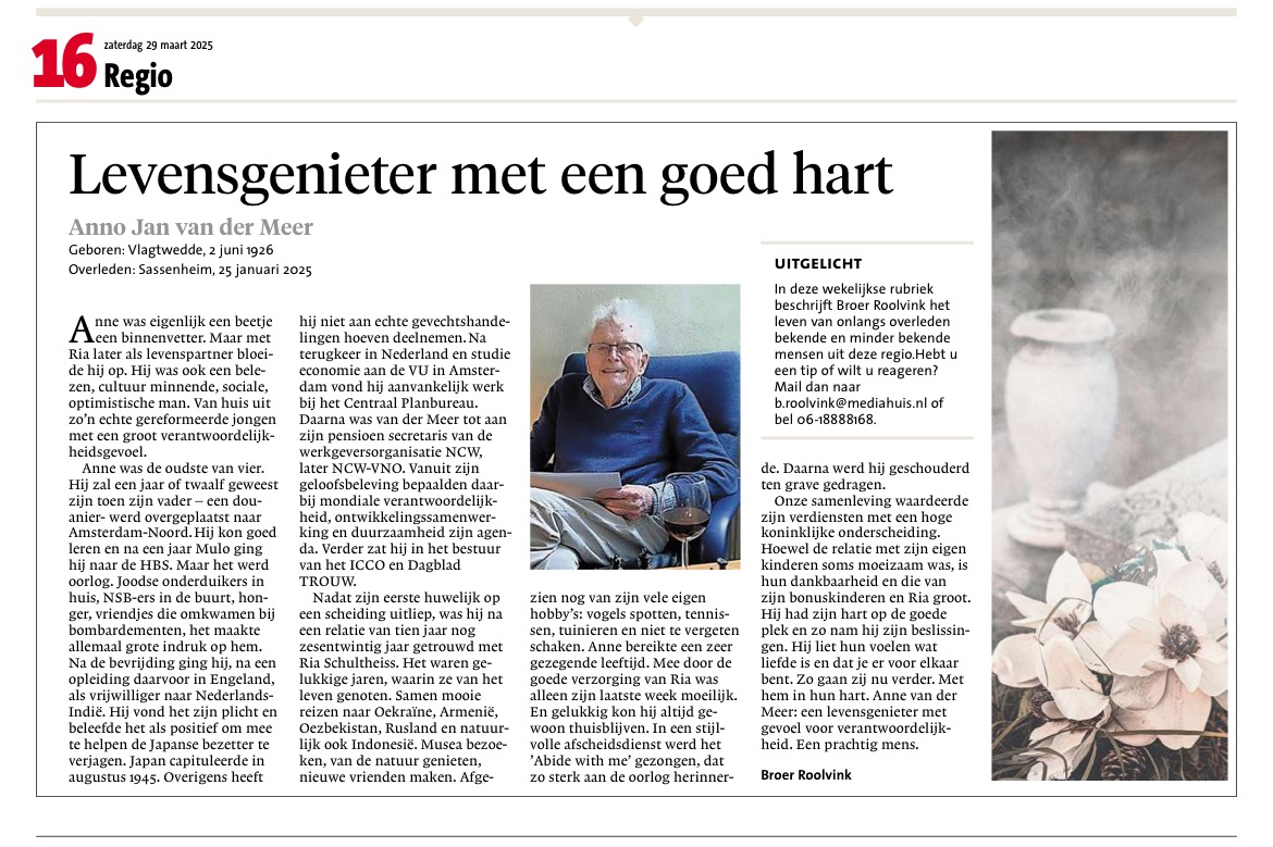 Artikel in LD over Anne vd Meer Door Maaijveld | 30 maart 2025 - 12:21 |30 maart 2025 Nieuws In het Leidsch Dagblad van 29 maart 2025 staat een artikel over ons oud-erelid Anne van der Meer die op 25 januari van dit jaar overleed. Zijn vrouw Ria maakte ons hierop attent. Bij deze publiceren we het artikel op de website. Bladwijzer de permalink.