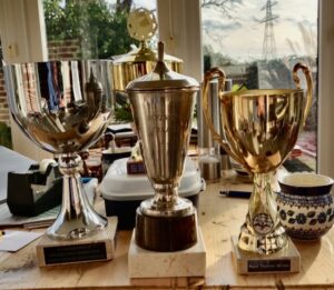 Daarom besloten Roel en ik om nieuwe bekers te kopen en zo trokken we naar een winkel in Noordwijkerhout. Daar wat rond gezocht en gekeken om een keuze te maken. Ziet Roel daar ineens zijn naam op een beker staan! Verbazing alom, maar na nog even beter kijken bleken al onze bekers daar te staan! Blijkt dat Albert, onze vorige voorzitter, daar de bekers naartoe had gebracht om ze te graveren, maar nooit meer heeft opgehaald omdat hij ondertussen plots was overleden…