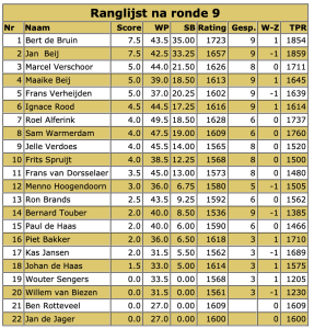 Mijn avond kon niet meer stuk. Topscorer van de avond. Drie uit drie! Wedstrijdleider Roel was zelfs zo lief om, nadat al het opgewaaide stof in de zaal neergedaald was, te zeggen: ‘Ik zal even de tussenstand van de rapidcompetitie opnoemen: 1. Bert, 2. Jan B. 3. Marcel 4. Maaike….’ Dat is nog eens wat anders dan ‘voor de vorm’ op de op een na laatste plaats staan in de reguliere competitie. Met veel dank aan mijn leermeester – (Picture this: Een uur voor aanvang van de speelavond: ‘Ik ken geen enkele opening, we hebben daar helemaal nooit op geoefend, het wordt helemaal niks vanavond, ik ga nul punten scoren, waaaaah.’ ‘Gewoon natuurlijke zetten blijven doen, dat kun je best! Maak je toch niet zo druk!’) –  bleven we met velen nog gezellig napraten en zo bleef het nog lang gezellig met wein, weib und geschach.