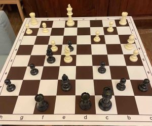 Jelle toverde speciaal voor de website uit zijn jonge hersentjesgeheugen nog deze stelling op het bord. Vanuit de stand op het bord speelt zwart (Jelle) hier Td7 en wit Ld4. De vraag is: wat doet zwart nu? Tip van Jelle: wit speelt niet bepaald foutloos. Zwart ook niet trouwens. Ben ik toch benieuwd hoe de partij verliep, maar eerst mag iedereen (opbouwend) reageren.