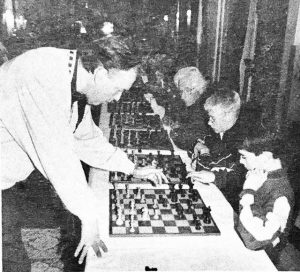Simultaan Hans Böhm vs districtsjeugdkampioen Jeffrey van Vliet ter gelegenheid van het 75-jarig bestaan van de Sassenheimse Schaakclub.