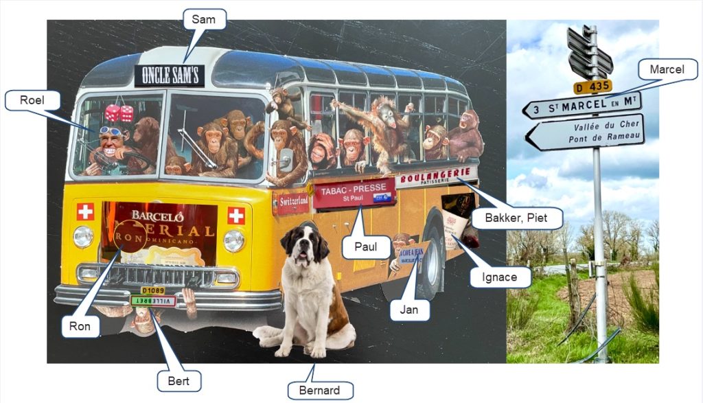 Paul bleek Roel niet gevonden te hebben (hij dacht dat het een hussel was van de letters Barcelo op de voorkant van de bus (als je Roel eruit haalt hou je BAC over), maar dat was niet goed. Roel daarentegen had zichzelf onmiddellijk herkend als – uiteraard – de buschauffeur, maar hij wist Piet Bakker niet te achterhalen. Wel fijn dat als hij straks naar Frankrijk gaat nu weet dat ‘boulanger’ bakker betekent. Anders wordt het water en brood zonder brood.