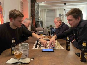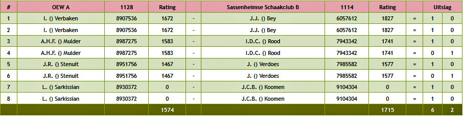 Na de eerste partijcyclus waren we al goed bezig: 4-0 voor OEW. Nog een halfje en we waren uitgeschakeld, dacht ik. Toen vertelde iemand dat als we verliezen met 4½-3½, we de kans liepen om – evenals vorig jaar – als ‘lucky loser’ door te gaan. Oei. Dus twee bordpunten voor ons moest toen de zaak redden. Dat lukte gelukkig.