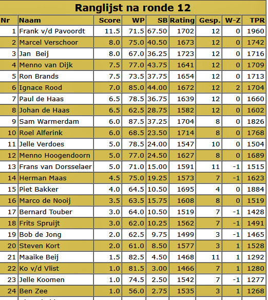 Na twaalf van de zestien speelronden hebben we een koploper in Frank v.d. Pavoordt met maar liefst 11½ punt (uit 12) en ben ik als titelverdediger tot dusver de enige die ranglijstaanvoerder Frank een halfje wist af te snoepen. Zo zijn er natuurlijk nog wel meer resultaten van eigenaar gewisseld gedurende de afgelopen drie speelavonden.