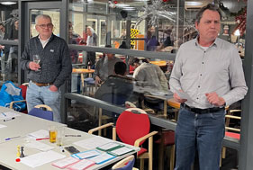 Tja, gelukkig was de organisatie (zie de foto met Daan Binnendijk (li) en Wim Zwinkels) zo aardig ons LSG-jeugdleider Rob Uittenboogerd uit te lenen tot ca. 16.00 uur en daarna was Maaike zo vriendelijk om het laatste uur de laatste vier ronden in te vallen (zeg maar gerust bereid was als slachtvee te dienen, want daar kwam het op neer – red.). We waren toen pas een complete SSC-ploeg. Opvallend was wel dat een aantal spelers van SSC vanaf het moment dat Maaike binnenstapte opeens veel beter gingen spelen. Blijkbaar een uitzonderlijke kracht van het SSC bestuurslid communicatie, die bij binnenkomst vroeg, met één oog op de tussenstand: ‘Zijn dit de uitslagen of is dit de ranglijst?’ Eeeeeh, de uitslagen, dus … 🥶