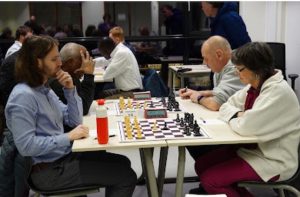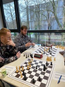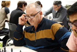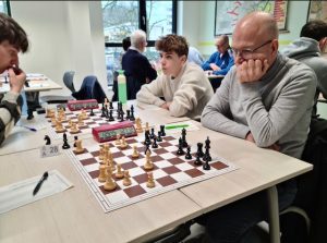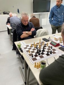 Marcel scoorde een halfje tegen ene Dewi, dat klinkt al als demi – half dus; ik hou ervan als het klopt. Helaas zou hij daarna weer twee nullen incasseren. Ook Bert moest helaas twee keer het hoofd buigen – onder anderen tegen een speler met een rating van 2210 – voordat hij de laatste partij van die dag op zijn naam kon schrijven. Jan B. kreeg jammer genoeg gelijk met zijn geklaag over het ‘geheel uit vorm zijn’ en scoorde de tweede nul op rij.