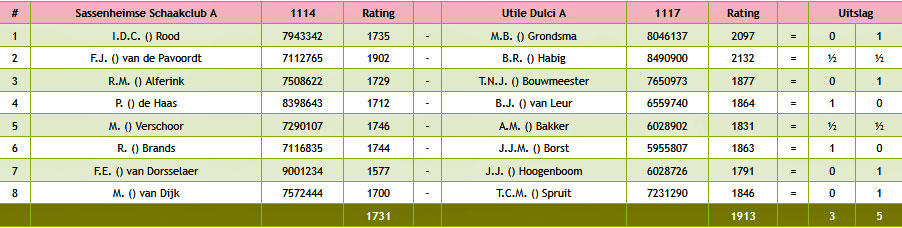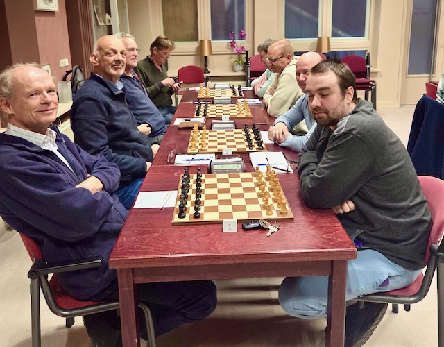 Dan volgt Jelle weer met: Ron wint! Maar Menno verliest: 2,5 – 3,5. En dan: Marcel remise: 3-4. Teamleider Jean vraagt of 4-4 er nog in zit. Alleen Frans is op dat moment nog bezig en dan komt de harde waarheid: 5 Utile Dulci pionnen tegen een Sassemse loper …. Verloren, helaas.