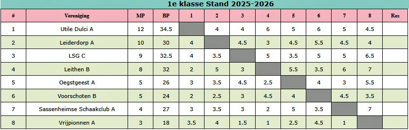In de eindstand van de 1e klasse was het erg opvallend om te zien dat er geen enkele ploeg wilde promoveren en/of degraderen. Zelfs in de slotronde was te zien dat sommige wedstrijden een andere uitslag lieten zien dan zou worden verwacht op basis van speelsterkte. Zo koos zelfs het sterke Leithen B voor de veilige vierde plek. Zie de website van de LeiSB voor de persoonlijke uitslagen. Het is m.i. ook waanzinnig om in een competitie van zuilen (hoofdklasse-1e klasse-2e klasse-3e klasse en nog een recreatieklasse) twee teams uit die klassen te laten promoveren en degraderen. M.i. zou er één team moeten promoveren en één degraderen uit deze klassen (behalve de recreatieklasse, daarvoor bestaat geen promotie/degradatieregeling). Een mooi onderwerp voor de ALV van de LeiSB?