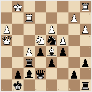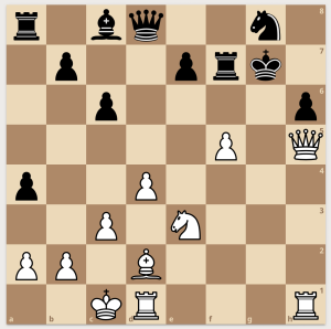 Kijk eens goed naar dit fragment in mijn partij. Na een zware (lees: saaie) gesloten Engelse opening (1. c4-c5 2.Pc3-a6 3. g3-Pc6 4. Lg2-d6, etc.) bereikten we bovenstaande stelling met voor mijn tegenstander nog 1 minuut op de klok en ik 7 minuten. Wat zou je spelen in deze stand met zwart? Als je suggesties doet in een reactie op dit artikel op de website dan geef ik over ongeveer een week het vervolg.