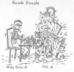 In mijn oude beleving speelde de schaakclub Utile Dulci in de Veen in een gebouw met een toren met een grote tulp als afbeelding op het gebouw. Daar waren ze echter al vijf jaar geleden uit weggepest hoorde ik later van een speler/barkeeper en ze zijn erg blij met het vogelhuisclubhuis waar twee clubs van vogelfluisteraars huizen met veel bekers op de materiaalkast. Het was echter langs het water moeilijk te bereiken en bij het passeren moest je niet nachtblind zijn, maar we vonden het uiteindelijk ruim op tijd en werden met een lekker kopje koffie ontvangen! Het kon – toen – allemaal nog niet stuk.