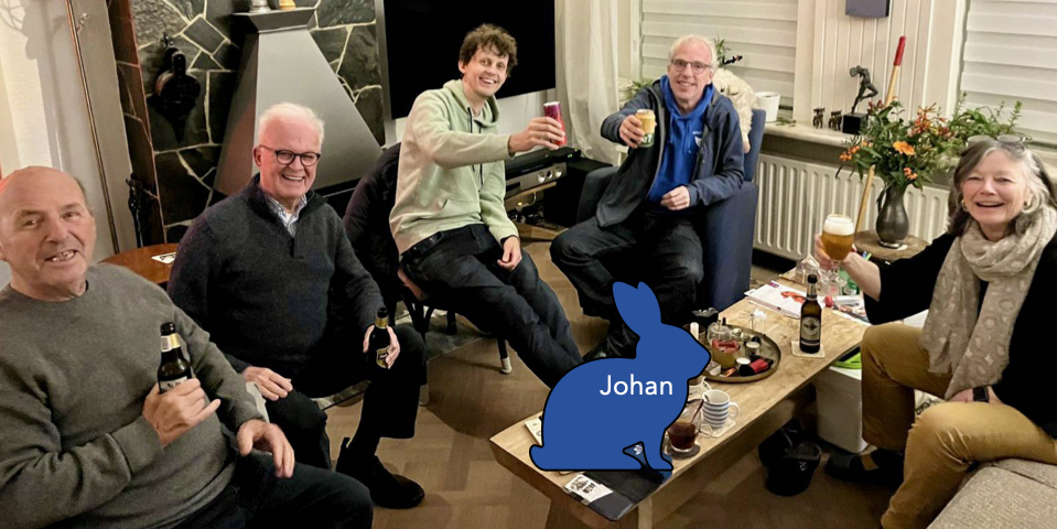 We waren uitzinnig van vreugde, want eindelijk hadden we ons eerste matchpunt binnen, hoera!!! Van de gehate nul af! We besloten dat dit feit gevierd moest worden. Frans: ‘Jammer dat ’t Onderdak dicht is, anders konden we nog een biertje drinken.’ ‘Bij ons kun je ook onderdak, hoor,’ sprak ik opgewekt en seinde snel Jan in om bier uit de schuur te halen. In rap tempo (Frans) of via de toeristische route (Menno) scheerden we naar ’t Onderdak, waar de voertuigen geparkeerd werden. Johan moest helaas het hazenpad kiezen, omdat hij wel heel erg vroeg op moest de volgende dag, maar de rest liep gezellig mee naar dat andere onderdak, waar er nog lang nagepraat werd over ons eerste matchpunt, én over het belang van een goede teamgeest, want die was er niet alleen door het gelijkspel, maar zeker ook door het afsluitende nakaarten bij ons thuis, waar bovendien de tactiek voor de volgende wedstrijd vast doorgenomen werd. Hier een selectie (nee, we gaan niet zeggen wie wat zei, want dan kan de tegenstander zich daarop voorbereiden …):
