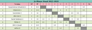 Bert had volledig gemist dat hij een pluspion had en ruilde vervolgens af naar een remise-eindspel. Paul met groot voordeel verzuimde ergens de winst en gaf in het afspelen ook zijn voordeel weg (½). Ron leek materiaal te gaan winnen, maar kwam ook in een gelijke eindspelfase terecht, waardoor we – met 5 remises en 2 volle punten – onze koppositie handhaafden in 2024 (De Vrijpionnen spelen 1 februari nog tegen OEW A, die uitslag is hieronder dus nog niet meegenomen, maar doet aan de koppositie niets af).