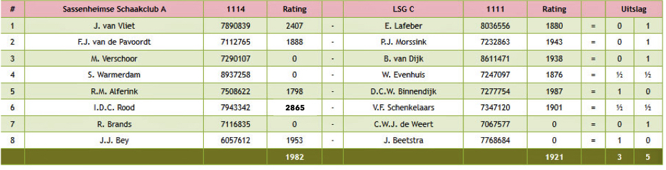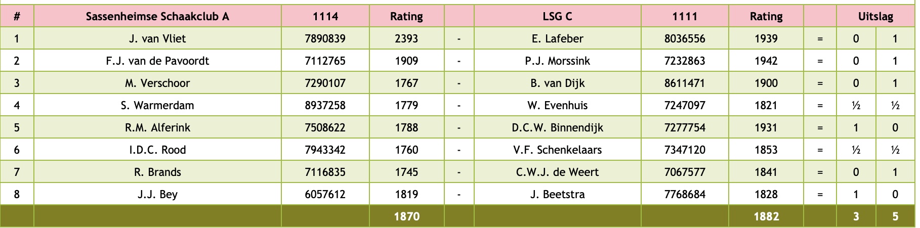 Over strijd was niet te klagen, alleen het afmaken was opnieuw onder de maat. Na een verliespartij van Ron (liet een paard insluiten), kon ik de stand in evenwicht brengen nadat ik ook een paard wist te veroveren (1-1). Hierna ging het flink mis en kwamen we op een 1-3 achterstand door verliespartijen van Frank en Marcel (beiden hadden flink sterke LSG-invallers tegenover zich). Toch konden we nog hopen op een kleine winst nadat Roel hun 1e bordspeler Daan Binnendijk (op bord 5 dit keer) het nakijken gaf met een matvariant (begreep ik van Roel). Na een tijdnoodremise van Ignace – met minder dan een minuut op de klok miste hij de winst – waren Jeffrey en Sam onderweg naar twee bordpunten. Maar nadat de pionnenovermacht van Jeffrey niet tot wasdom kwam en hij zelfs verloor, nam een vermoeide Sam alsnog een remiseaanbod aan (3-5 i.p.v. 5-3).