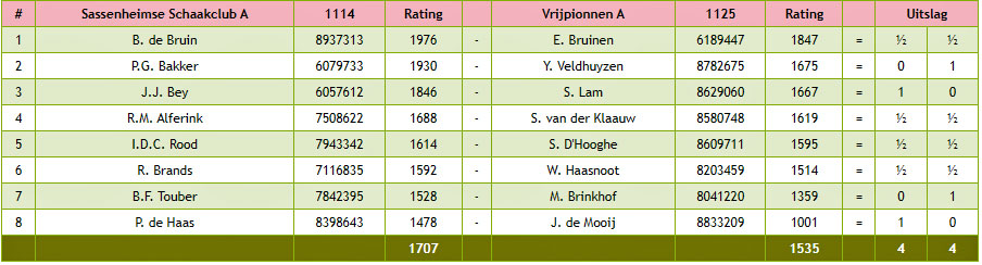 Over strijd hadden we niet te klagen. Er werd geconcentreerd gespeeld en na korte tijd werd er al een gevaarlijke achterstand van 1-2 bereikt; door nederlagen van Bernard en Piet tegen jongeren en een snelle winstpartij van Paul. Mijn winstpartij (waarvan men dacht dat ik verloren stond) bracht de stand op 2-2 en de winstpoging daarna van Roel (kreeg een remiseaanbod) eindigde daarna toch in een remise (2½-2½). De tijdnoodfase brak aan en de al eerdergenoemde musketiers namen toen genoegen met een puntendeling. Achteraf gezien een juiste beslissing mijne heren!