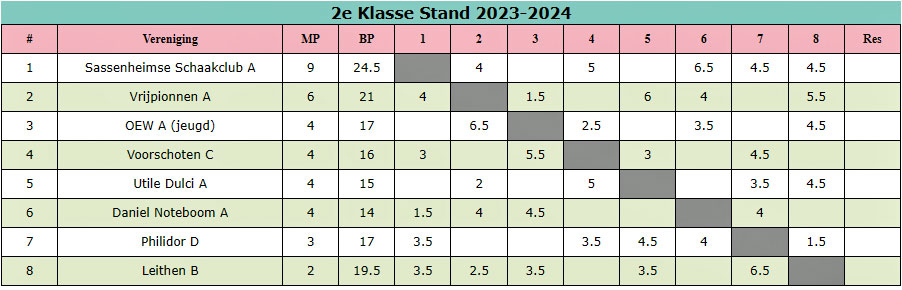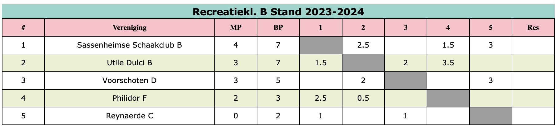 Op 27 februari moesten (in recreatieteam B) Utile Dulci B en Voorschoten tegen elkaar. Die strijd eindigde in 2-2 waardoor ons team nog steeds bovenaan staat. Maar… de volgende ronde hebben we een bye, dus dit kan er nog heel anders uit komen te zien. Tenzij zowel Ultile Dulci als Voorschoten D verliezen, dan blijven we aan kop staan. De laatste wedstrijd (thuis) is op 16 april tegen Voorschoten D.