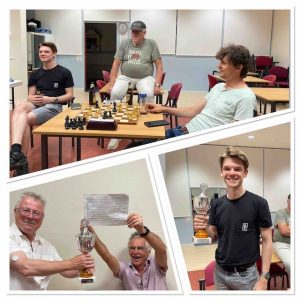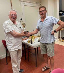 Bert winnaar van de Schoenmakersbeker, de snelschaakbeker en Interne competitie. Voorzitter Paul (in de ‘zomerhit van 2023’ kleur blauw) reikt de prijzen uit.