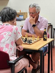 De tweede ronde was tegen Bernard, een prettige tegenstander, óók omdat hij nog wel eens remise aanbiedt; dat heeft natuurlijk alles te maken met het remisekoning-kampioenschap (RKK) 2022/2023. Hoe hij aan z’n scores komt ontdekte ik zo’n twee weken geleden, toen ik hem in de E-zaal op een gegeven moment op zijn horloge zag kijken, daarbij de woorden uitsprekend: ‘Zo, het is tien uur, ik mag remise aanbieden.’  Dus zó werkt het bij hem, dacht ik nog. Wat een pech dat ik al in de tweede ronde tegen hem moest. En inderdaad, het werd geen remise, maar pure winst voor Bernard. Met mijn halfje in the pocket vond ik het prima. Alles beter dan vier nullen.