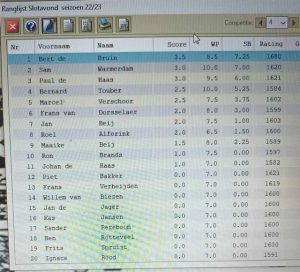 De nazit was als altijd zeer gezellig, ondanks het ongelijk verdelen van al die bekers. Nu kun je prijzen aan allerlei onderwerpen hangen. Meestal gaat het hierbij om ‘de beste’, maar je kunt ze natuurlijk voor allerlei andere verdiensten uitreiken. Zo zou de geheimzinnige 5e beker (want waar komt dat ding eigenlijk ineens vandaan?) – de BZN (Beker Zonder Naam) – ook prima uitgereikt kunnen worden aan de Remisekoning van het seizoen. Winnaar 2022/2023: Menno!
