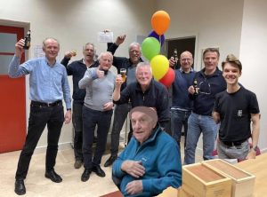 Op 23 april was voor ons team de slotavond van de externe competitie. Ons eerste team – Jan B. (captain), Bert, Piet, Roel, Ignace, Ron, Bernard, Sam en co-captain Paul – dat zo kordaat van start was gegaan wist het tot de laatste wedstrijd spannend te houden, door in de voorlaatste ronde sportief de wedstrijd aan de jonge tegenstander te laten. Zouden ze die laatste wedstrijd winnen, dan was er geen vuiltje aan de lucht. Speelden ze gelijk- tegen concurrent nr 1, hun directe tegenstander – was er ook niets aan de hand. Bij verlies van hen waren ze afhankelijk van de mate waarin verloren werd i.v.m. de bordpunten (SSC-A had 3 bordpunten meer dan tegenstander Utile Dulci A) en óók van de resultaten van de andere concurrent: Vrijpionnen A, die bij het ingaan van de laatste ronde 7 MP en 25 BP hadden. Kortom, een échte slotmanifestatie, een jubilerende schaakclub waardig!   .