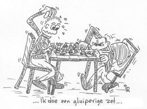 Marcel ging weer voortvarend te werk. Niks afwachten, erop los. Voor de winst! De tegenstander leek te wankelen….. maar deed plots een onverwachte zet! “Had je niet gezien, hè?” grijnsde hij, wilde zeker ook een keer commentaar geven tijdens een partijtje schaak. “Nee,” on-grijnsde Marcel, “Mooie zet…. niet gezien…” en even later streek hij de vlag.