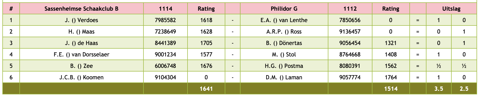 Ons B-team speelt in de 3e klasse van de LeiSB. Daar spelen kennelijk zoveel teams, dat de competitie in tweeën is gehakt. De eerste 5 rondes waren succesvol en het is nu tijd voor de play-offs. Hoe dat werkt? Geen idee. Op de een of andere manier worden de twee halve competities met elkaar ‘verwoven’, of zo. Afijn. Afgelopen dinsdag (31 maart 2026) was de eerste van twee play-offs, thuis tegen Philidor G.